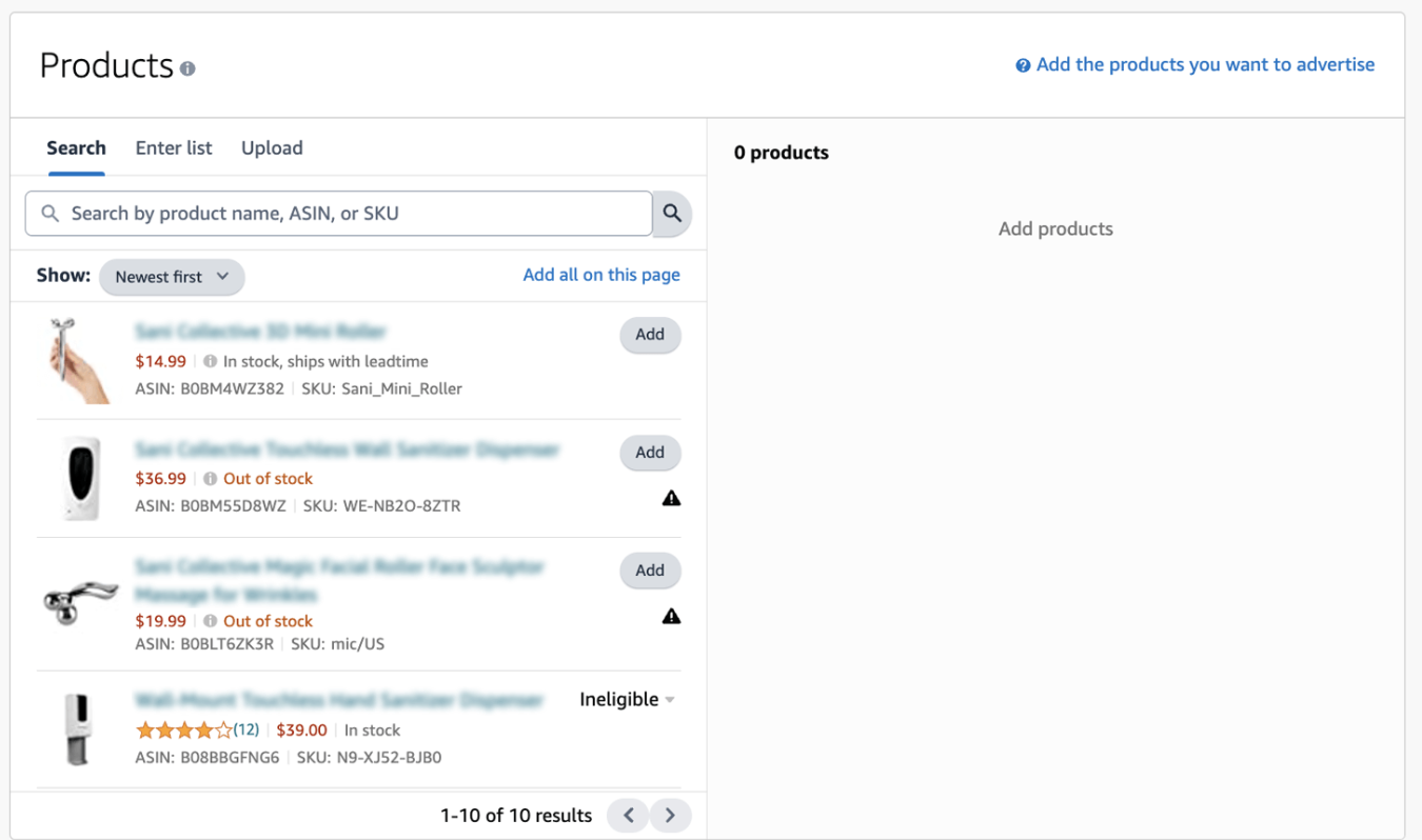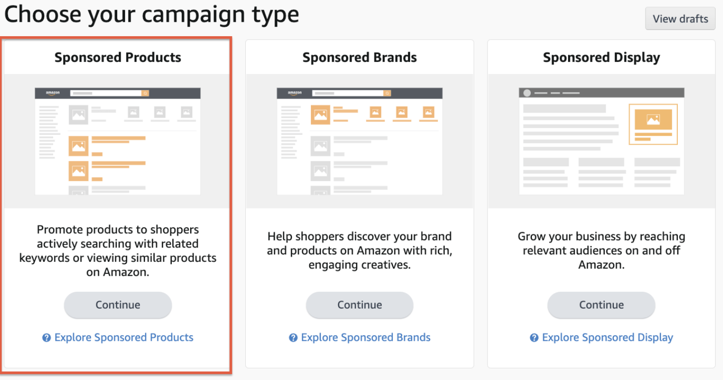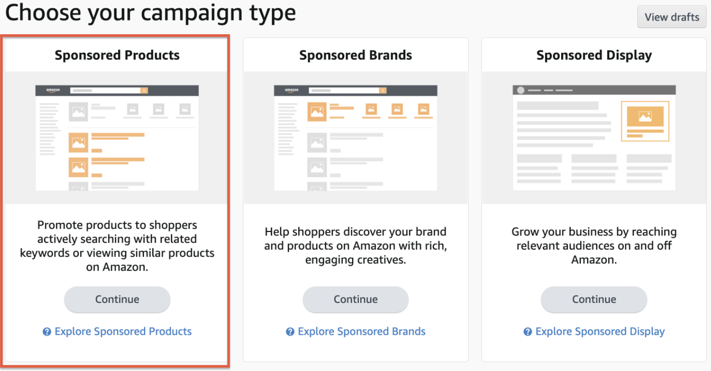 Khi tạo chiến dịch PPC đầu tiên, bạn sẽ thấy ba loại quảng cáo mà Amazon cung cấp: