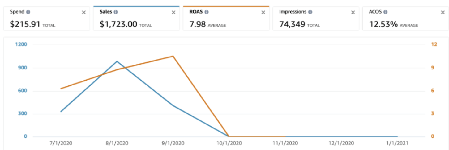 Tại đây, bạn có thể thấy tóm tắt tổng quan về chiến dịch của mình, bao gồm tổng chi tiêu, doanh số quảng cáo, tổng số lần hiển thị, ROAS và ACoS.