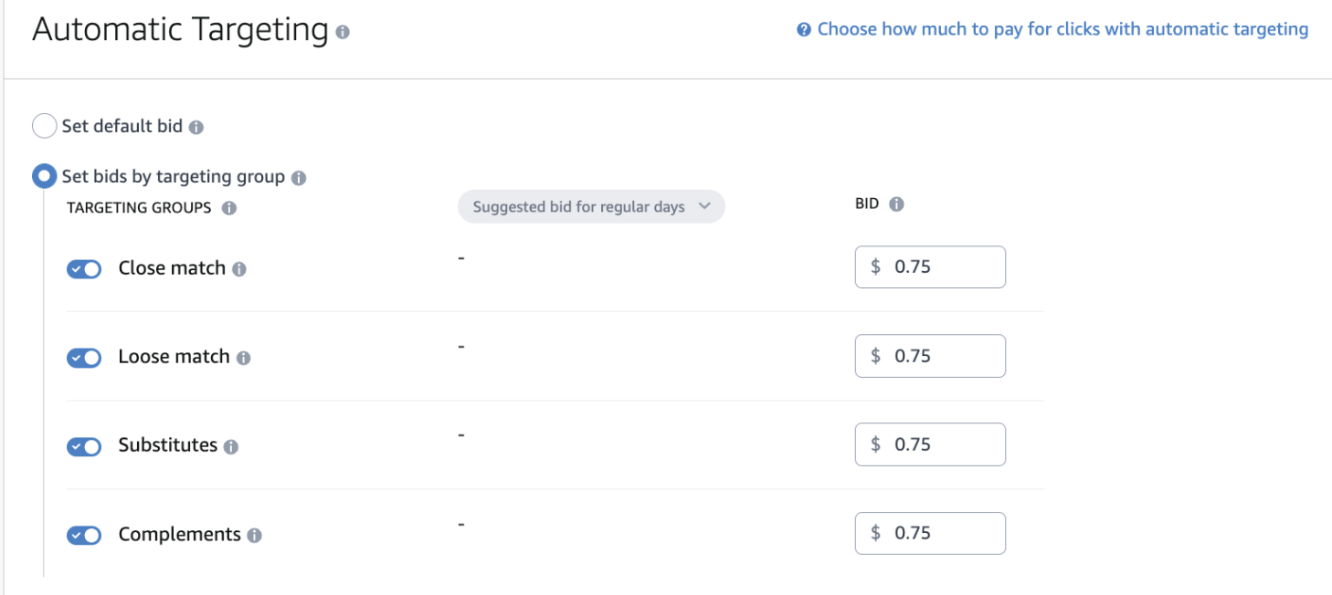 Amazon đưa ra giá thầu mặc định là 0,75 đô la. Nhưng chúng tôi khuyên bạn nên bắt đầu với 2-3 đô la để đảm bảo dễ dàng thắng trong các cuộc đấu giá. - Đặt giá thầu theo nhóm nhắm mục tiêu