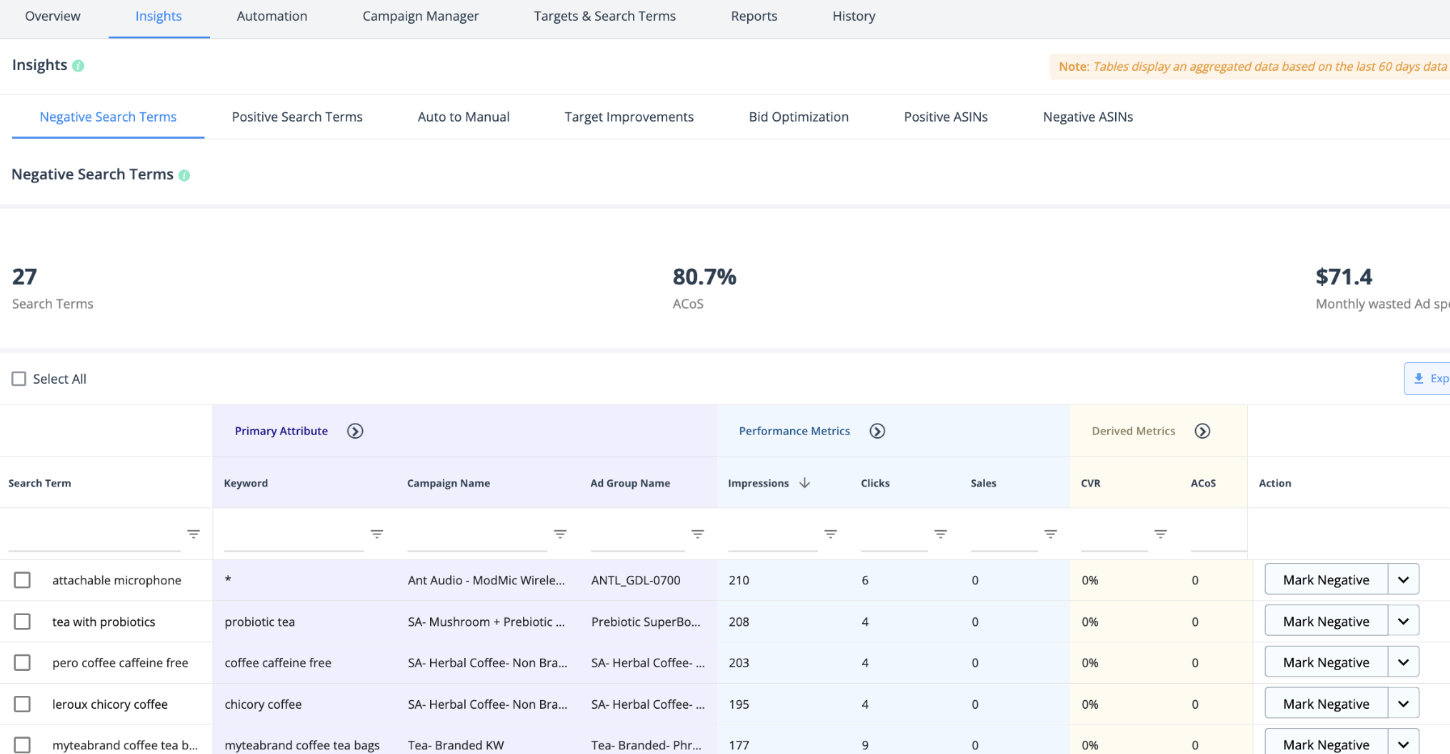 Truy cập bảng điều khiển SellerApp > Advertising tool > Insights. Tại đây, nhận tất cả các từ khóa tìm kiếm tích cực và phủ định và ASIN từ các chiến dịch của bạn dựa trên ACoS mục tiêu của bạn.