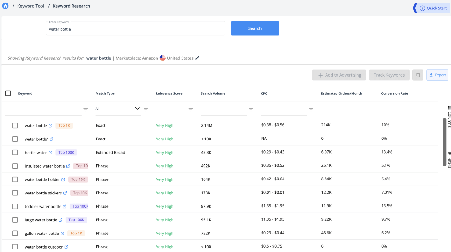 Sử dụng công cụ từ khóa Helium10 để tìm các từ khóa liên quan, có lượng tìm kiếm cao và chuyển đổi cao cho các chiến dịch quảng cáo của bạn.