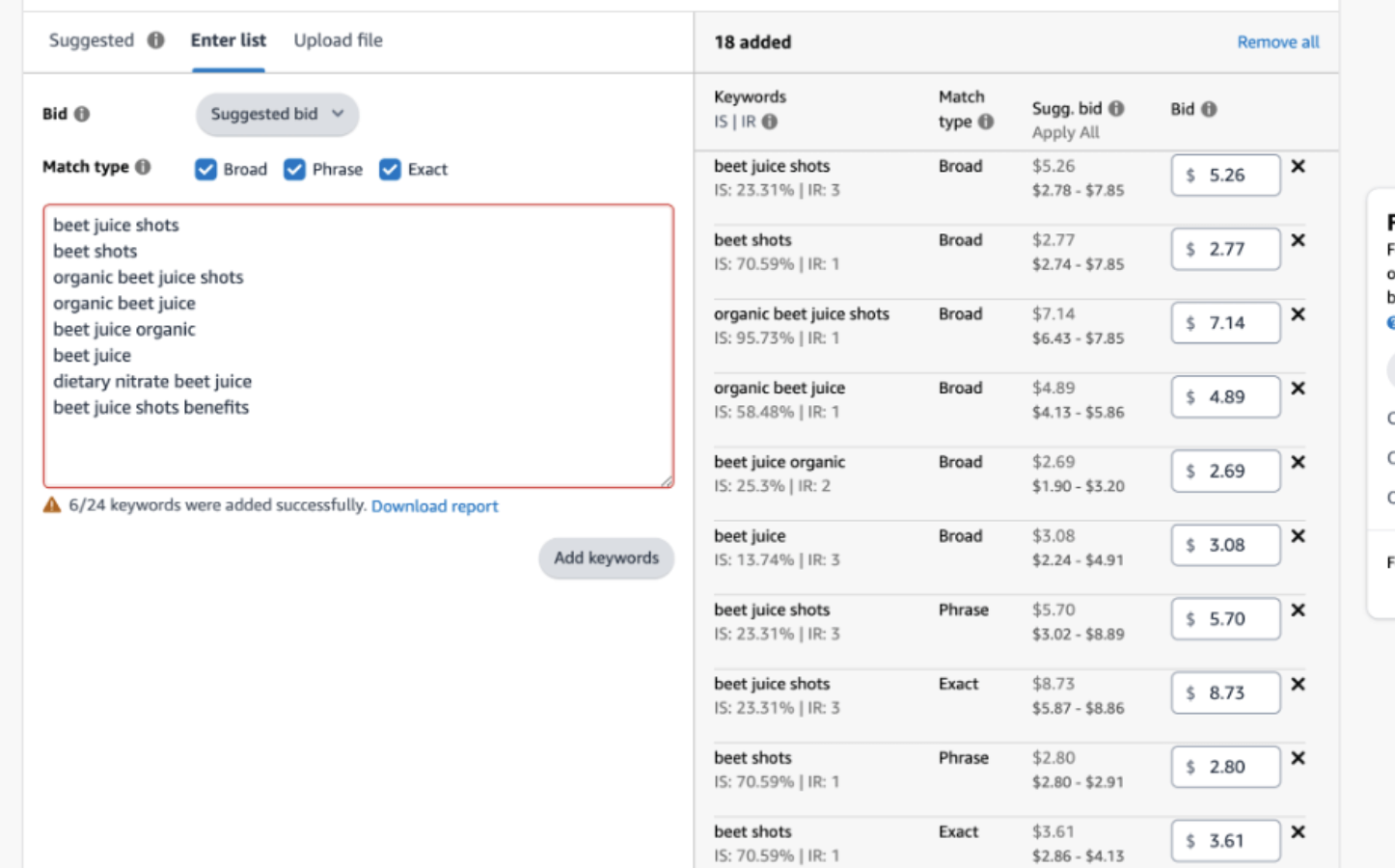 Tùy chọn nhắm mục tiêu thủ công mang lại cho bạn quyền kiểm soát lớn hơn đối với chiến dịch quảng cáo. Bạn có thể chọn từ khóa từ chiến dịch tự động hoặc tìm các từ khóa có lượng tìm kiếm cao, liên quan bằng công cụ nghiên cứu từ khóa SellerApp. Bạn thậm chí có thể đặt giá thầu tùy chỉnh cho từng từ khóa.