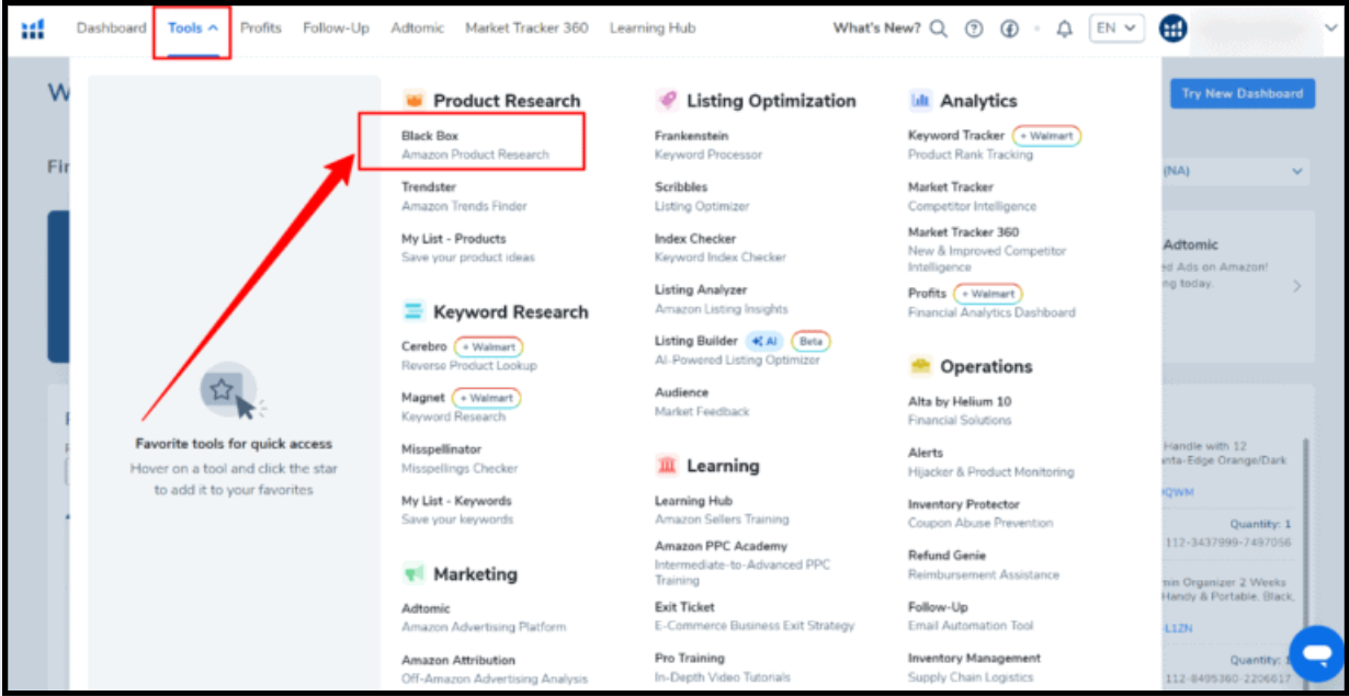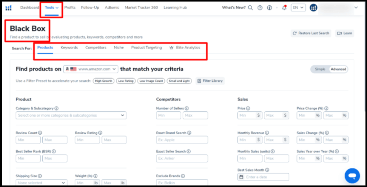 Black Box là công cụ nghiên cứu sản phẩm chính của Helium 10. Nó cho phép bạn áp dụng các bộ lọc vào cơ sở dữ liệu gồm hơn 500 triệu sản phẩm để tìm ra các sản phẩm xu hướng và tiềm năng bán chạy nhất. Dưới đây là cách sử dụng Black Box để tìm sản phẩm xu hướng: