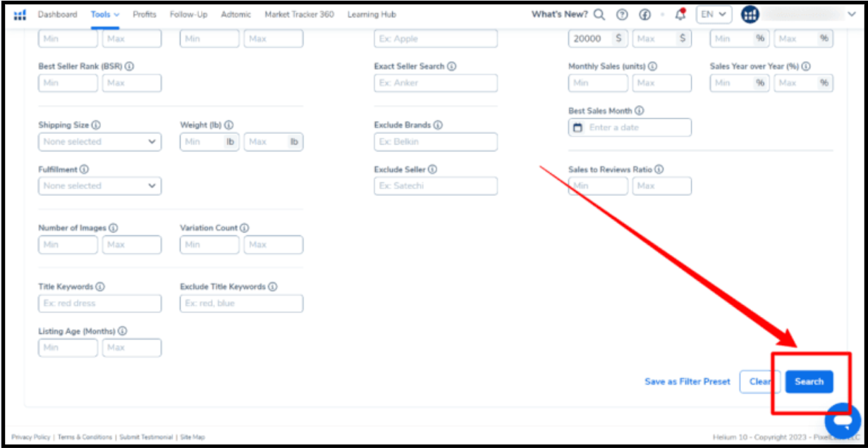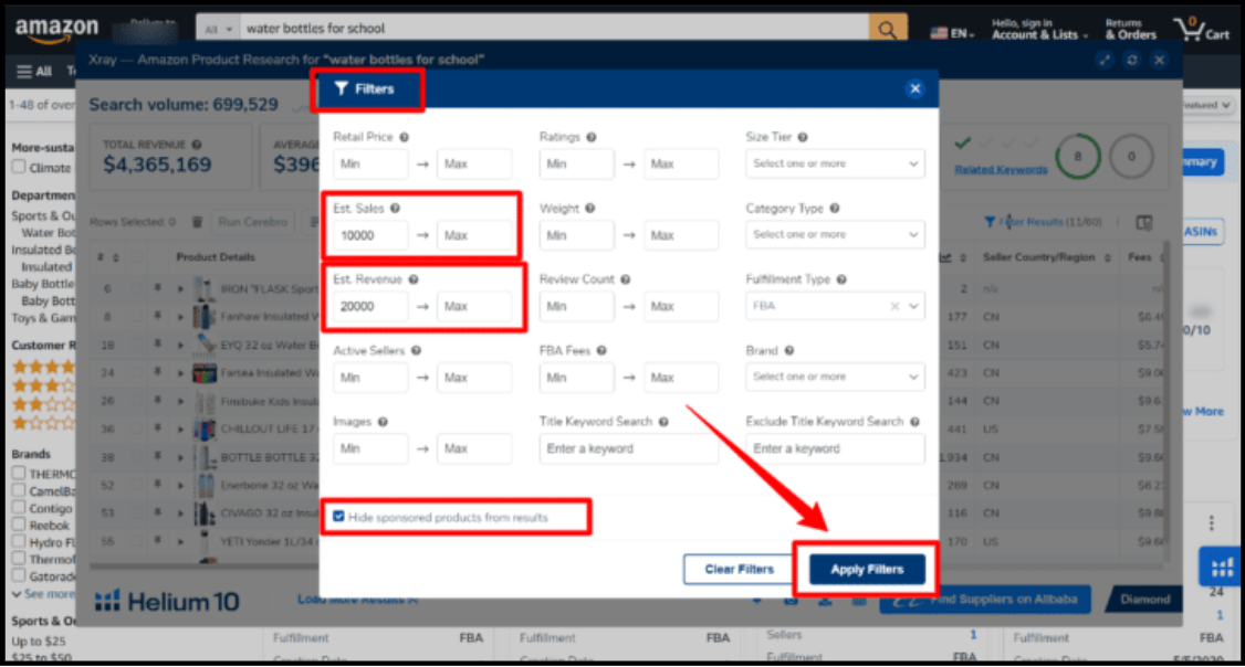 5. Lọc kết quả theo doanh số ước tính và doanh thu. Ngoài ra, ẩn các sản phẩm được tài trợ nếu bạn muốn tập trung vào doanh số tự nhiên. Nhấn “Áp dụng Bộ lọc.”
