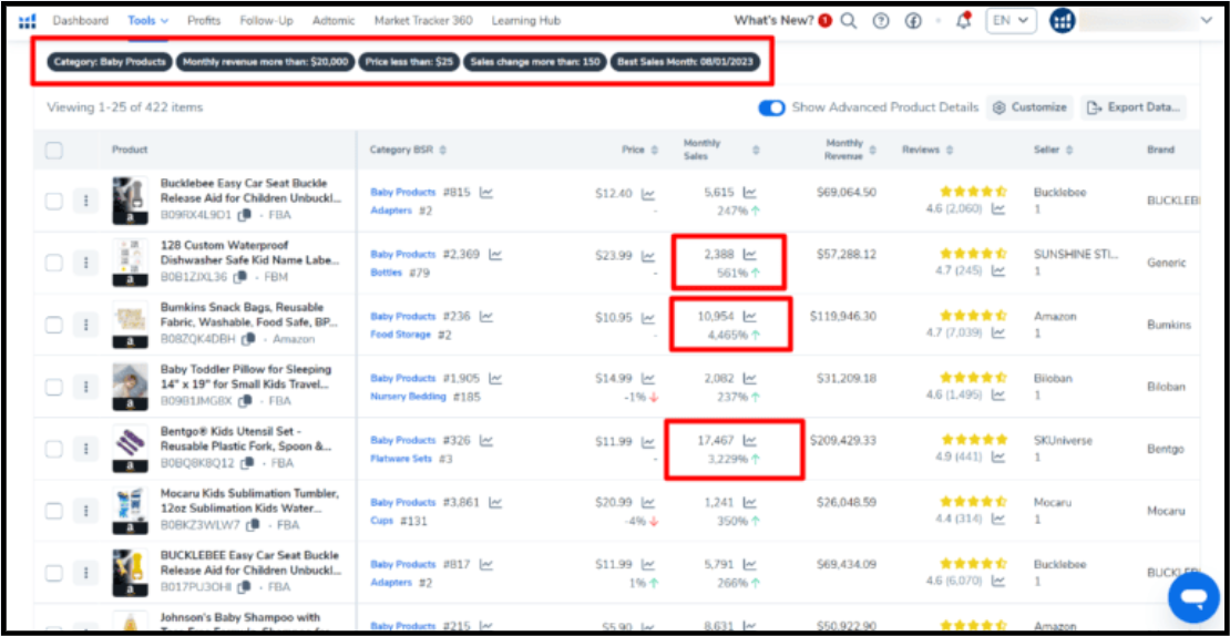 7. Trong ảnh chụp màn hình bên dưới, tôi đã kiểm tra các sản phẩm dành cho trẻ em có doanh thu ít nhất $20,000 mỗi tháng. Tôi đã lọc các sản phẩm có sự thay đổi doanh số tối thiểu 150% trong 90 ngày qua và có tháng 8/2023 là tháng bán hàng tốt nhất.