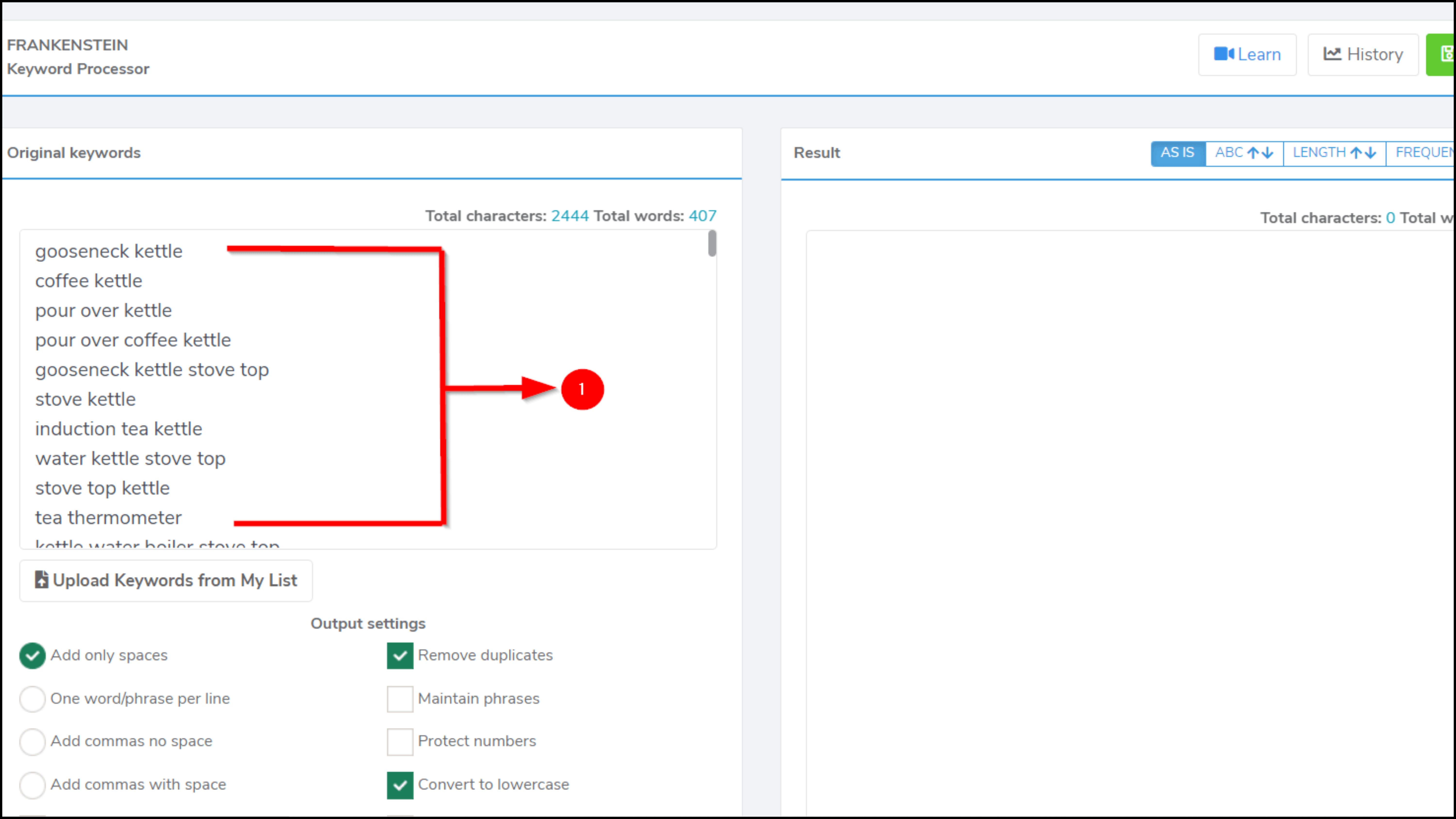 Bước 1 của cách xử lý từ khóa của Helium 10 Frankenstein