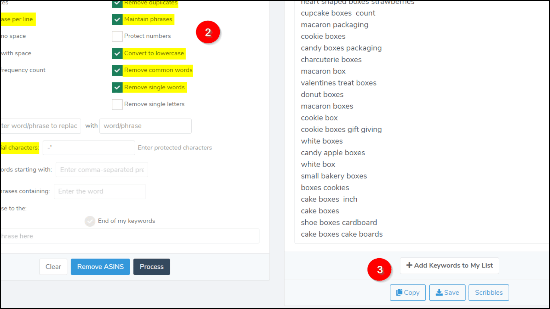 Có 3 lựa chọn: bạn có thể sao chép kết quả và dán chúng vào ngân hàng từ khóa hiện tại dưới dạng Excel, lưu từ khóa đã xử lý dưới định dạng .txt, hoặc gửi ngay từ khóa đến Scribbles để phân tích thêm.