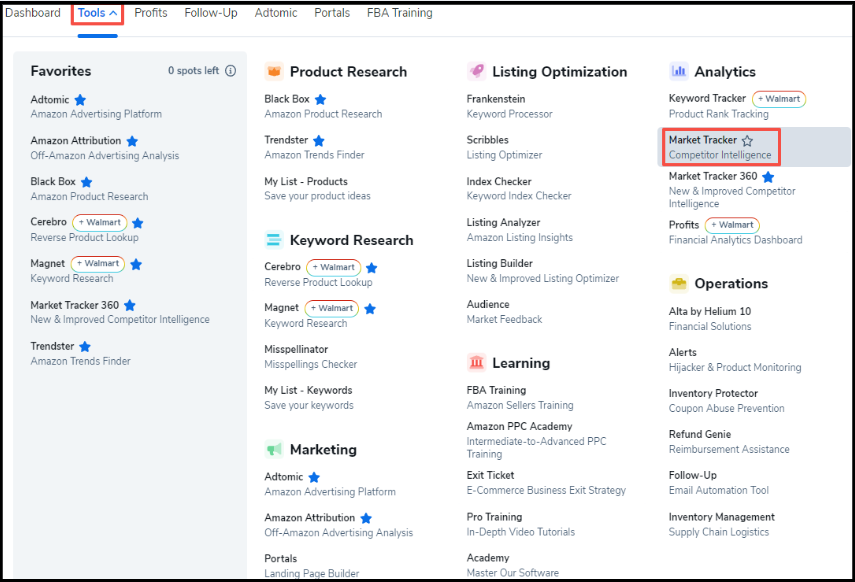 1. Mở Helium 10 Market Tracker từ menu Tools.