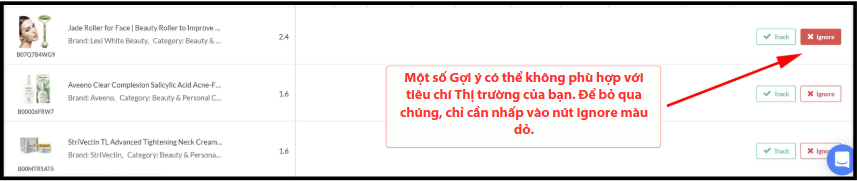 13. Trở lại danh sách Gợi ý, nếu bạn muốn bỏ qua một ASIN vì nó không phù hợp với Thị trường của bạn, nhấp vào nút Ignore màu đỏ. Market Tracker sẽ xóa sản phẩm khỏi danh sách Gợi ý và đưa vào danh sách Ignored Products.