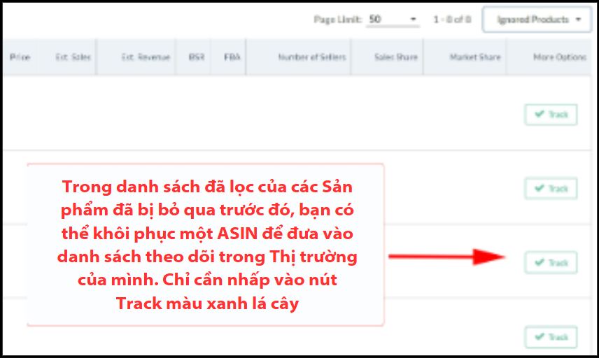 15. Trong danh sách Ignored Products, tìm ASIN bạn muốn theo dõi lại và nhấp vào nút Track màu xanh lá cây. Market Tracker sẽ đưa sản phẩm trở lại Thị trường của bạn.