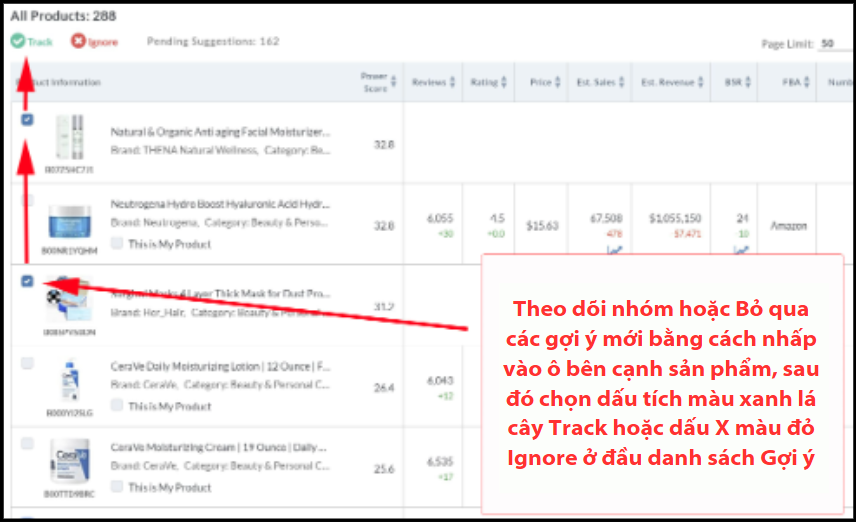 16. Nếu bạn muốn theo dõi hoặc bỏ qua hàng loạt gợi ý mới, chỉ cần chọn tất cả các ASIN bạn muốn hành động, sau đó nhấn Track hoặc Ignore.