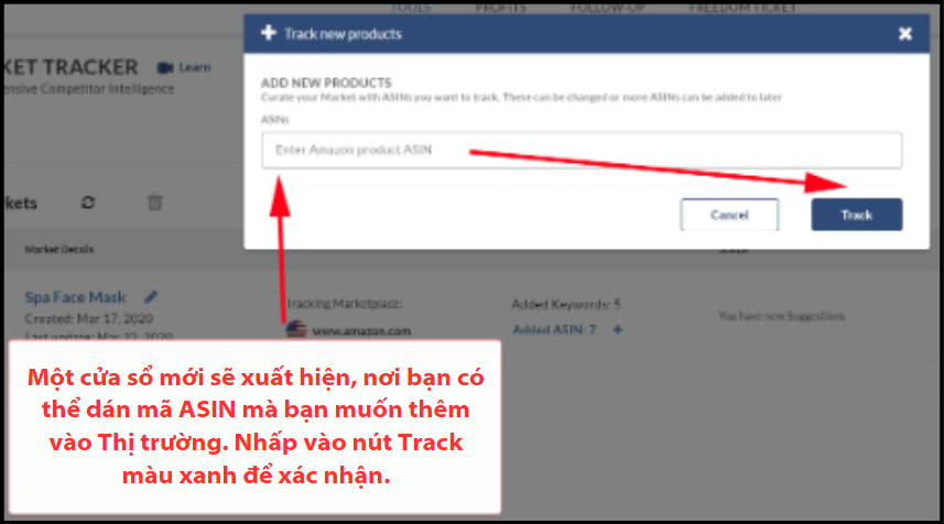 Dán hoặc nhập mã ASIN vào trường trong cửa sổ pop-up, sau đó nhấp vào nút Track màu xanh. ASIN sẽ được thêm vào Thị trường của bạn.