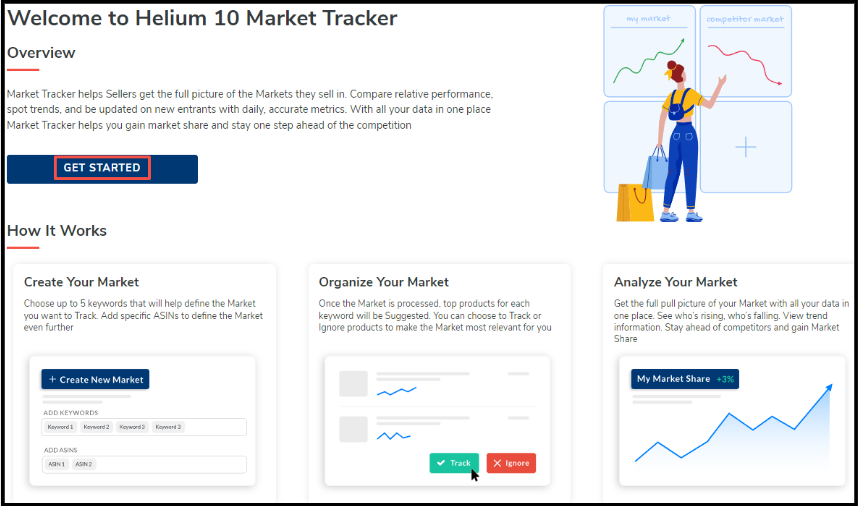 2. Lần đầu tiên mở công cụ, bạn sẽ thấy trang giới thiệu về các lợi ích cơ bản khi kích hoạt và sử dụng Market Tracker. Nhấn nút GET STARTED màu xanh ở bên trái, dưới phần Overview.