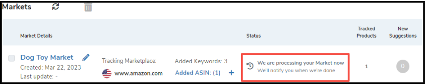Khi mới tạo một thị trường, Helium 10 cần thời gian (vài giờ đến 24 giờ) để thu thập dữ liệu ban đầu. Sau đó, dữ liệu sẽ được cập nhật hàng ngày.