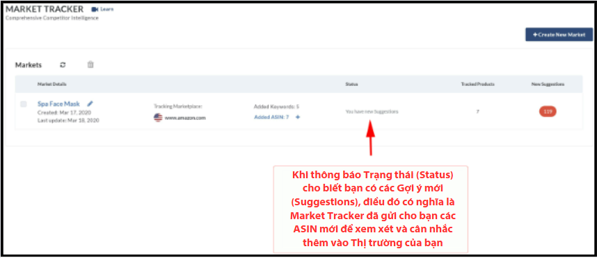 Helium 10 Market Tracker là một công cụ theo dõi hoặc tạo thị trường, nơi bạn có thể tạo ra thị trường của riêng mình dựa trên từ khóa, mã ASIN, hoặc sản phẩm cụ thể. Công cụ này cung cấp báo cáo hàng ngày về các thay đổi và cập nhật mới nhất trong thị trường mà bạn thiết lập.