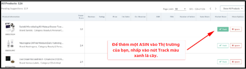 10. Nếu bạn thấy một Gợi ý phù hợp, nhấp vào nút Track màu xanh lá cây để thêm ASIN đó vào Thị trường của bạn.