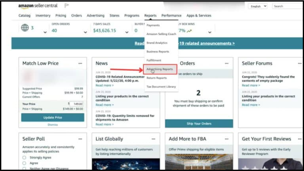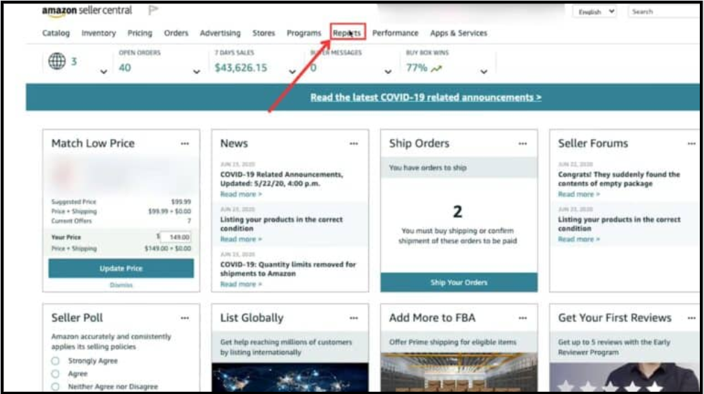 1. Nhấp vào tùy chọn “Reports” trên menu chính của bảng điều khiển Seller Central.